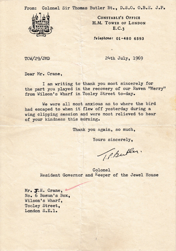 My paternal grandfather worked around the River Thames and London Docks, though I’m not sure what he did there. Below is a letter of thanks he received after helping to capture and return one of the ravens that had escaped from the Tower of London. Superstition holds that “if the Tower of London ravens are lost or fly away, the Crown will fall and Britain with it.” See the Wikipedia page for more about these ravens.